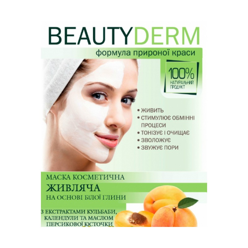 Готовая косметическая маска для лица ТМ BEAUTYDERM «Питательная» на основе белой глины с экстрактами одуванчика, календулы и маслом персиковой косточки: тонизирует и восстанавливает; повышает эластичность; разглаживает морщины; насыщает кислородом; обладает антиоксидантным и витаминизирующим действие.