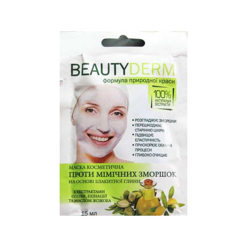 Готовая косметическая маска для лица ТМ BEAUTYDERM «Против мимических морщин» на основе голубой глины с экстрактом оливы, эхинацеи и маслом жожоба очищает и подсушивает кожу, устраняет жирный блеск, сужает поры, обладает бактерицидными свойствами, стимулирует обновление клеток кожи, разглаживает морщины, повышает упругость кожи.
