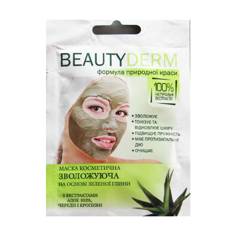 Готовая косметическая маска для лица ТМ BEAUTYDERM «Увлажняющая» на основе зеленой глины с экстрактами алое вера, череды и крапивы глубоко очищает, разглаживает морщины, повышает эластичность, тонизирует и восстанавливает кожу, оказывает противовоспалительное действие.