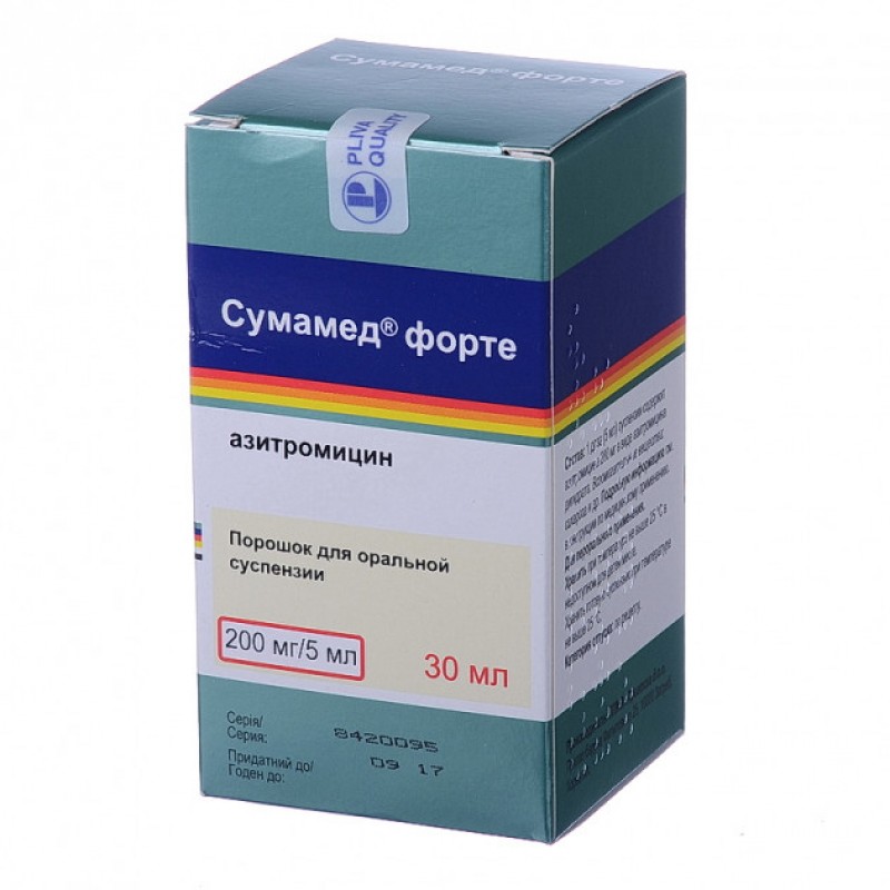 Сумамед форте порошок д/ор. сусп. 200 мг/5 мл по 30 мл (1200 мг) у флак.