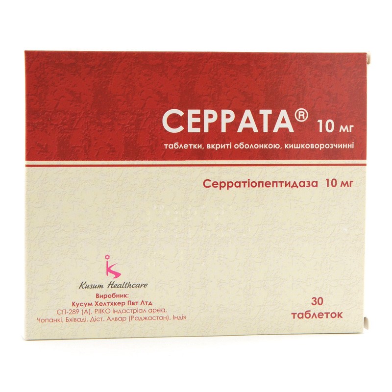 Фармакокинетика. Препарат проходит через желудок в неизмененном и абсорбируется в кишечнике. Максимальная концентрация в плазме достягается через 1 час. Серратиопептидаза в незначительном количестве определяется в моче.