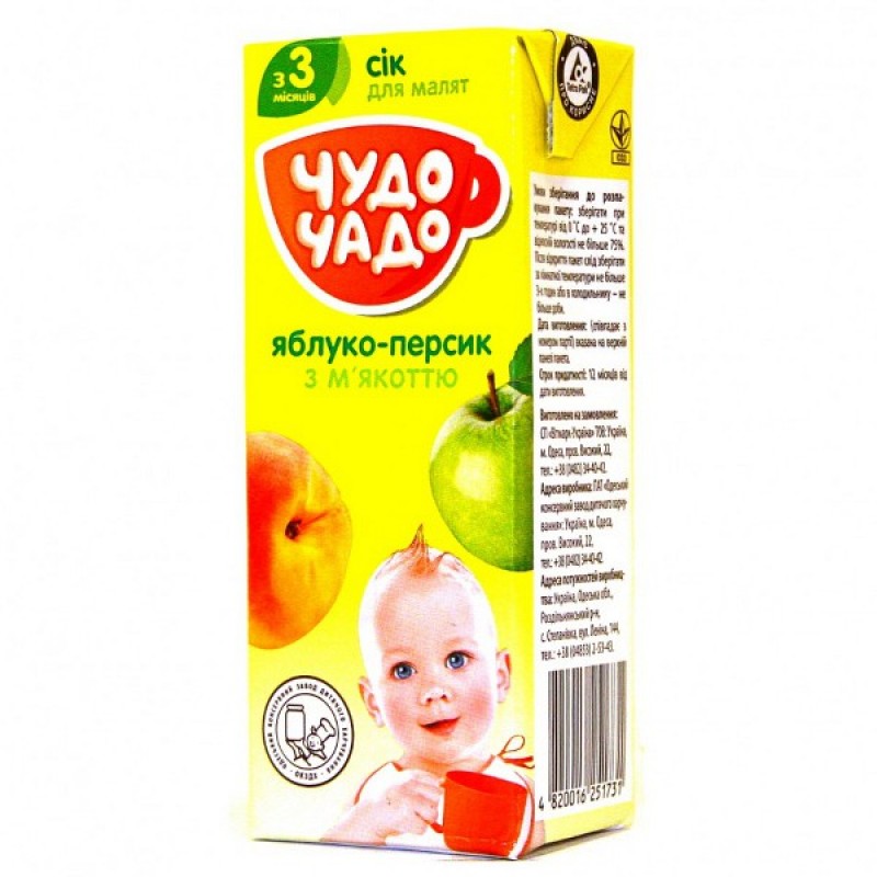 Сок Яблоко-персик с мякотью рекомендован для детей с 3-х месяцев. При его производстве не используются красители, ароматизаторы, консерванты и ГМО. Входящее в состав яблочное пюре обладает сильным очищающим действием, помогает в нормализации всех видов обмена в организме, а также нормализует тонус кровеносных сосудов. Персиковое пюре не менее полезно. Оно повышает уровень гемоглобина и улучшает пищеварение.